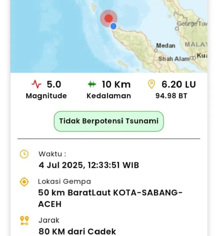 PELITANASIONAL.COM | SABANG – Gempa bumi berkekuatan magnitudo 5.0 mengguncang wilayah barat laut Kota Sabang, Aceh, pada Jumat siang, pukul 12.33 WIB. Informasi ini disampaikan secara resmi oleh Badan Meteorologi, Klimatologi, dan Geofisika (BMKG).